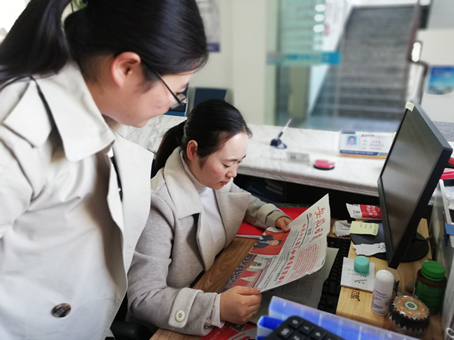 上圖為受理中心副主任、黨員方利云在與員工學習交流全會報道。