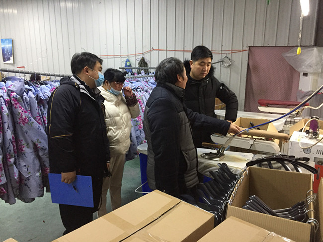 (上圖為富堨鎮(zhèn)政府副鎮(zhèn)長(zhǎng)朱超(中)帶隊(duì)在華邦公司車(chē)間檢查。)